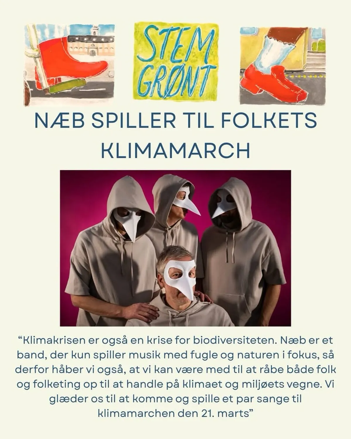 Vi spiller et par sange til Folkets Klimamarch kl 14.30 på lørdag den 21.marts på Christiansborgs Slotsplads. Hele arrangementet starter kl. 13 med masser af spændende talere bl.a Mogens Lykketoft og Lea Korsgaard. Greta Thunberg holder tale kl. 14.45 - lige efter vi har spillet, så vi er i sagens natur opvarmning til Thunberg. Det er gratis at deltage, og du kan melde dig til eventet HER.